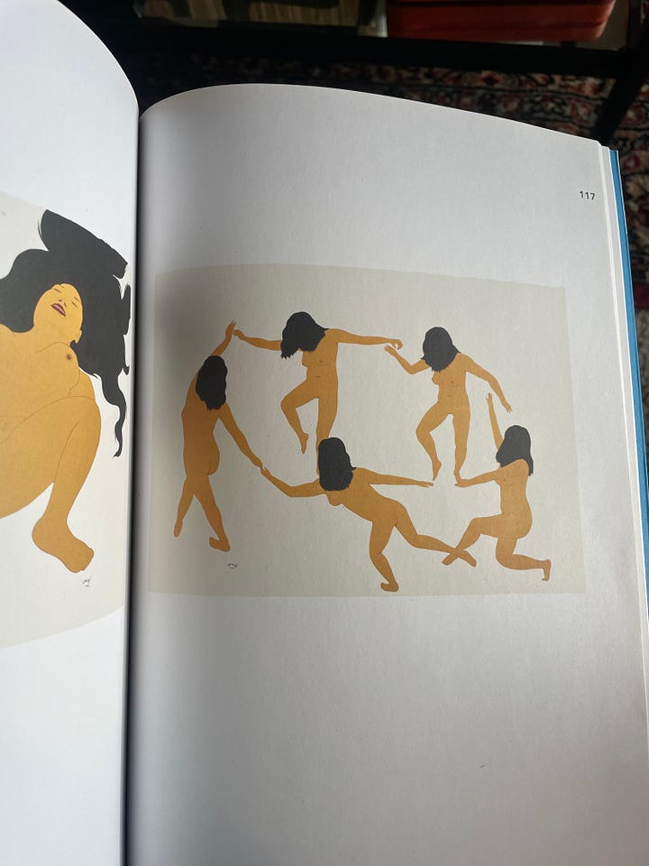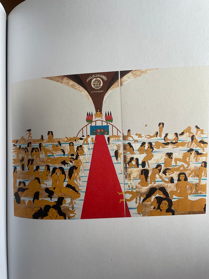 I only recently discovered Afghan visual and performance artist Kubra Khademi, and holy shit I’m so glad I did. Her work is radical and powerful and tough, and at the same time, there’s something really tender, soft, and romantic in her representations. A recurring figure in Khademi’s visual art is the naked woman’s body taking up various configurations in space. She paints the same body — modeled after her own — so that, when there are many women depicted in a painting, they sort of look like clones. In one painting, Untitled (Cinq femmes en dansant) (2019), the women hold hands and form a circle, à la Matisse’s dancer’s, but Khademi’s figures look more like they’re stumbling than dancing. In another, Parliament Scene (2021), a crowd of women are depicted in a kind of minimalistic, somewhat abstract rendering of a parliament meeting room. Afghan flags are raised at the front of the room surrounding a woman sitting at the head of parliament with her legs spread open. The women in the seats of the parliament room are mostly coupled together, making love. I simply love these paintings. I’m so captivated and moved by them — I feel like I can’t look away. The role-reversal of women taking up space in Afghanistan’s political sphere is already a radical representation; and on top of that, the women are naked and and engaging in sexual acts. I think the sex is necessary here not exactly as a statement or representation of free, queer love (although, in some ways, it encompasses that ethos) but rather as a reclamation of women’s sexuality in particular — no matter what form it takes — and a renunciation of the sexist, misogynistic, male-dominated mode of governance in Afghanistan that works tirelessly to control women’s bodies and sexuality.