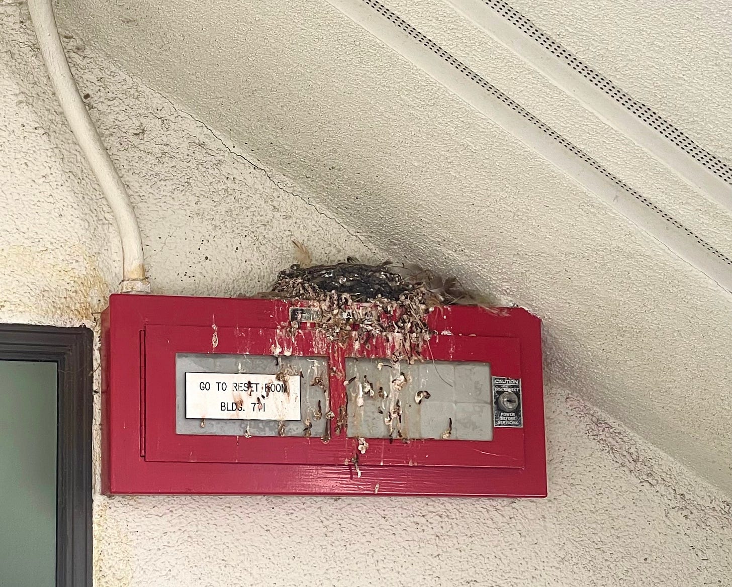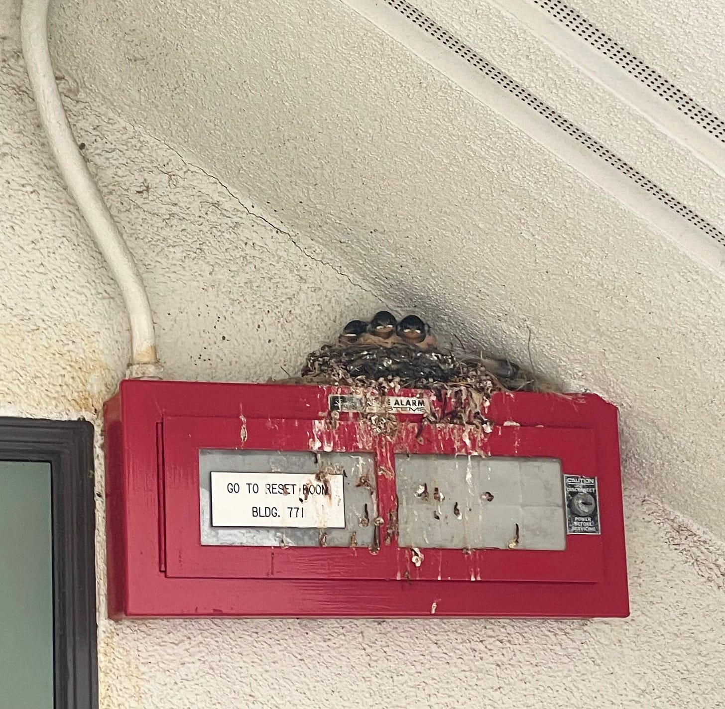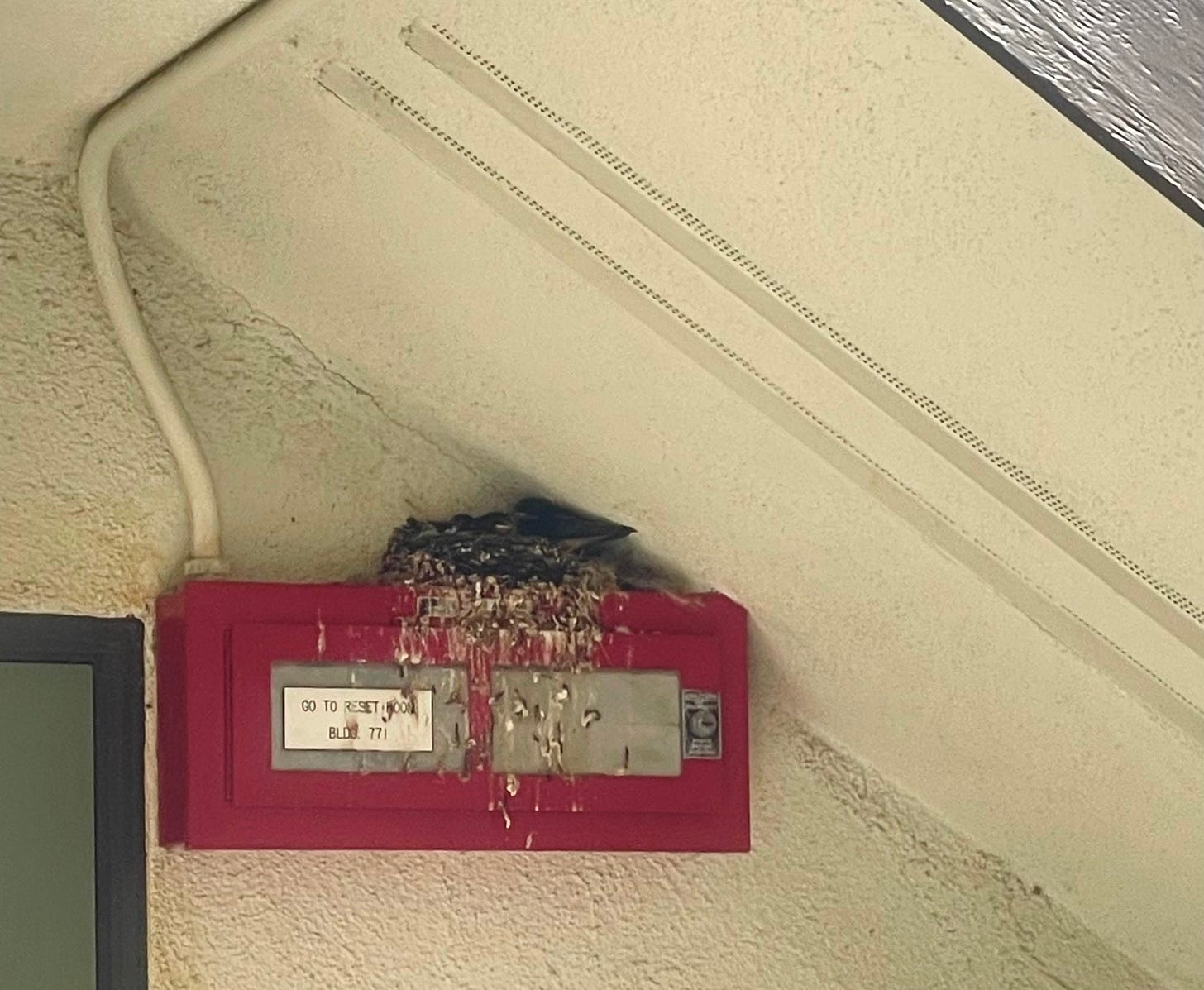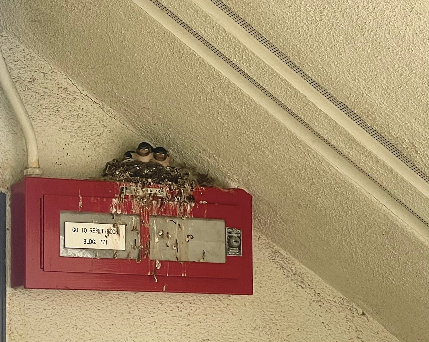 8:55 am. They’re out! They escaped the eggs! Two of them are finally out of their shells and perched beside the nest! I saw the mom fly out just now too. I was trying to ID the bird since now I know it’s not a dark-eyed junco. I was thinking maybe it’s a cliff swallow, but I’m not sure. The chicks in the nest have a bright, white stripe underneath each of their eyes, and I mixed that up with the white forehead of a cliff swallow. I can’t seem to figure out what kind of bird I just watched go from nestling to fledgling in that nest beneath the stairwell.