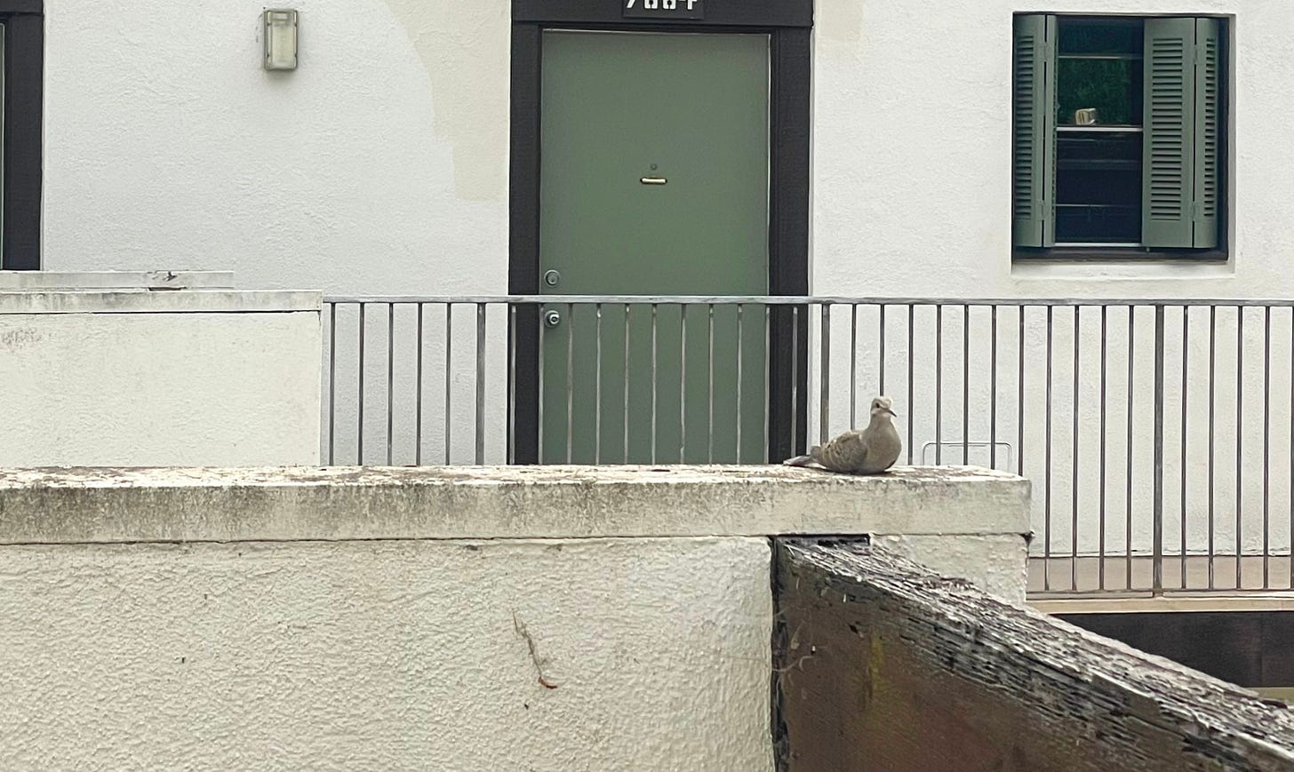 11:02 am. Mourning dove perches elegantly on the ledge of the stairwell right outside our door.