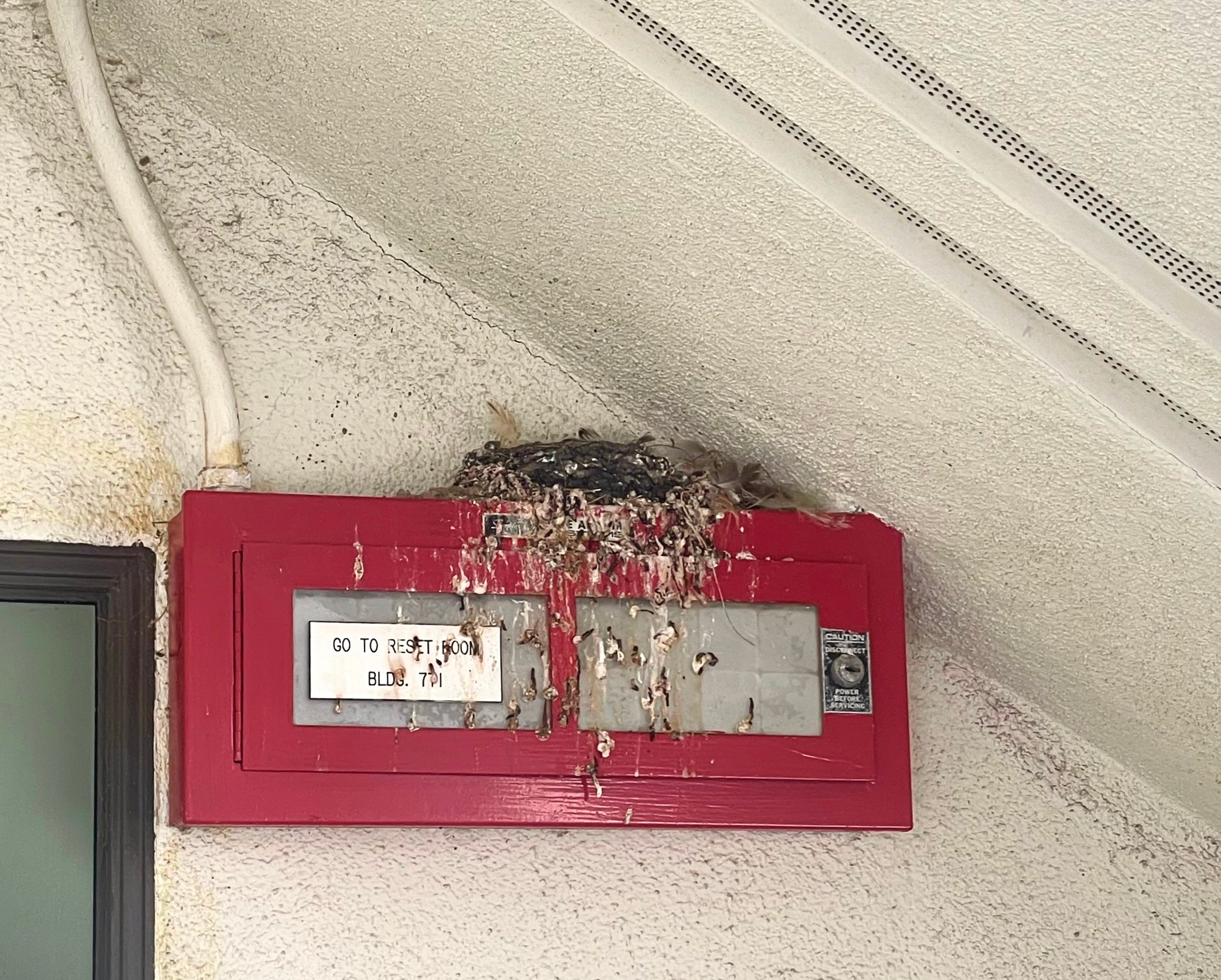 8:33 am. The baby chicks are chirping again in their nest above a small fire alarm box under the staircase. I saw a dark-eyed junco (I think) perched on a lamp on the wall next to the nest. I wonder whether the chicks are hers. Every time I walk past the nest, I see the chicks’ mouths wide open at first, only for a brief moment. Then they close them right away. Their heads bob around, as if floating like a balloon, their necks strings. I think I can make out at least four or five heads or beaks, but I can’t tell whether their eyes are open yet.