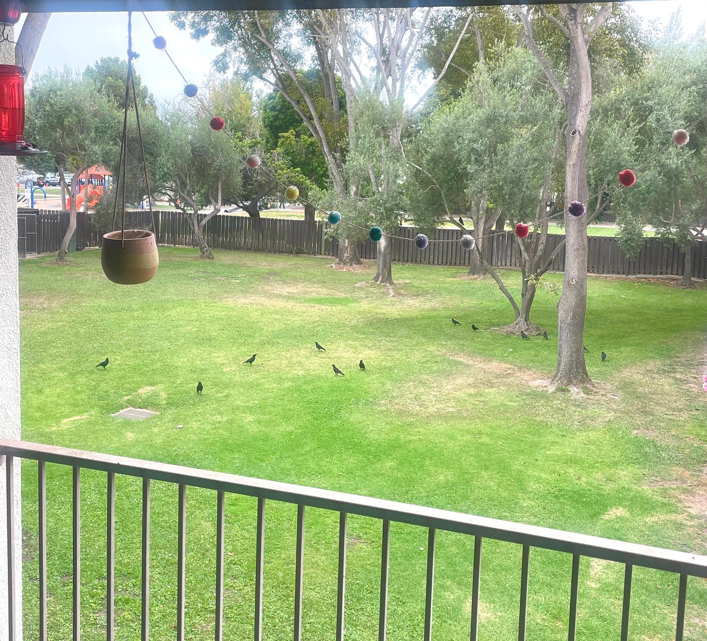 9:02 am. A murder of crows hangs out in the courtyard. They’re scattered across the dewy grass. I count twelve in total.