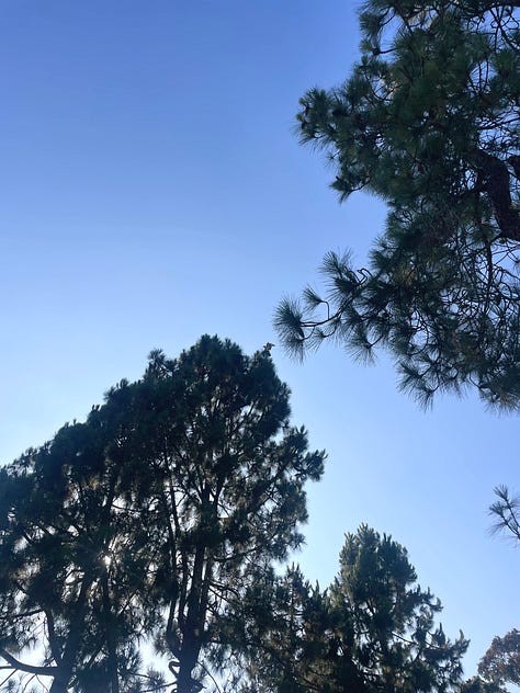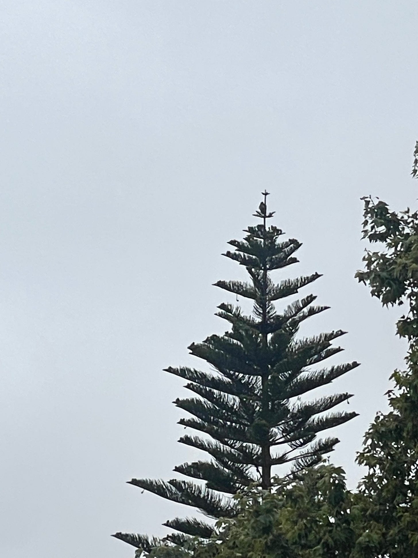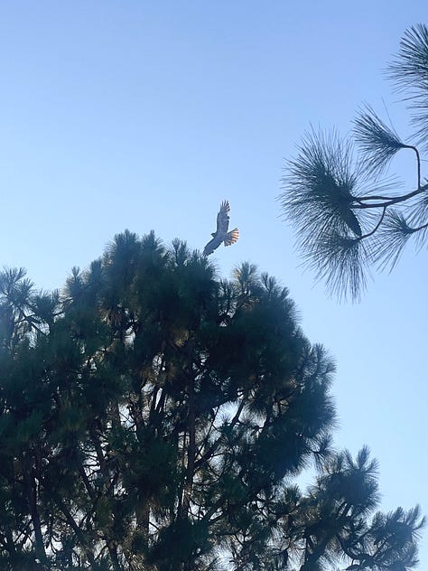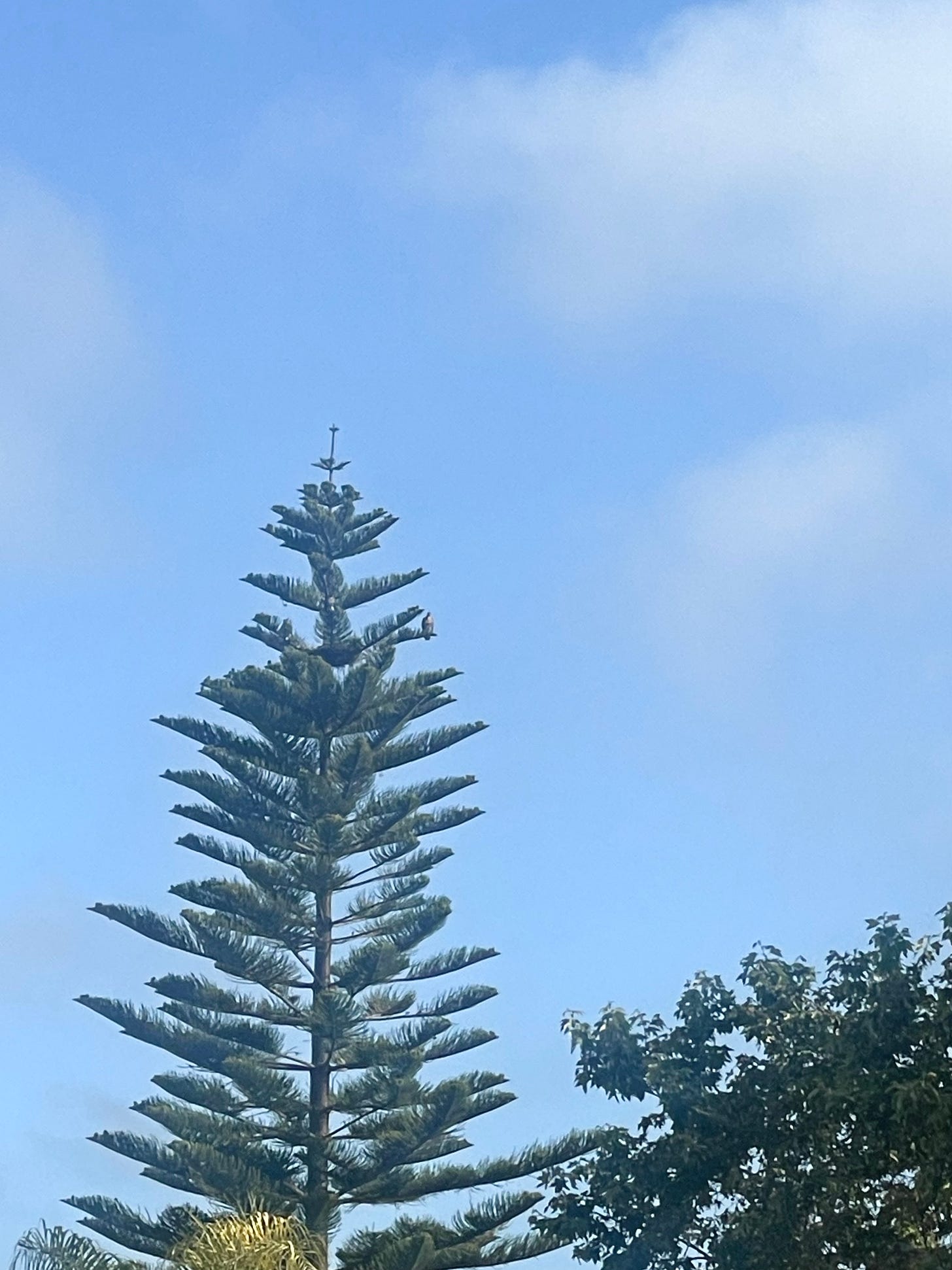 9:05 am. Walking to my car to go to yoga and hear the red-tailed hawk calling again. I look up and see it perched at the top of the pine tree again, like a perfect Christmas tree topping.