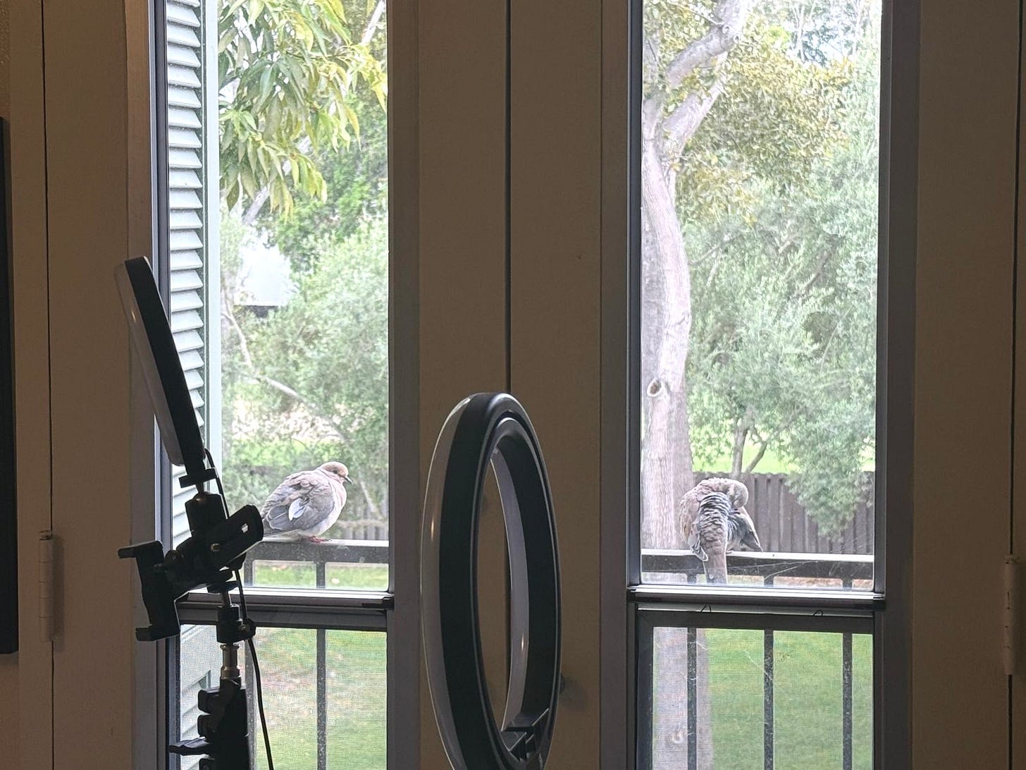 8:59 am. Two very fluffy mourning doves perch on the railing of the French window balcony outside the office. I’m sitting on the green couch with R, staring in awe — this is the first time I’ve seen mourning doves (or any bird that big) on the French window balcony. One of them is perched in stillness, while the other cleans itself. I was sad when I had to get up and leave.